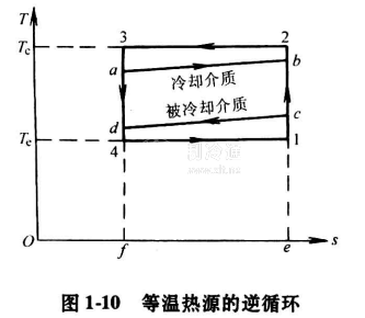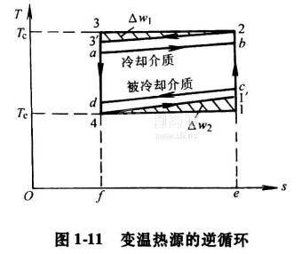 為了減少傳熱溫差所引起的能量損失,制冷劑與介質之間必須保持最小的傳熱溫差,并且所有各點均保持定值。通常情況下,冷卻與被冷卻介質在冷凝器和蒸發器的進出口溫度固定不變,因此,要使制冷劑與介質流保持等溫差的唯一辦法,是變更制冷劑在冷凝器和蒸發器中的溫度,即制冷劑的冷凝與蒸發過程是在一定的溫度范圍內變溫進行的。由圖1-11可知,若冷卻介質溫度由a點升至b點、制冷劑的冷凝溫度由點2變至點3';被冷卻介質溫度由c點降至d點、蒸發溫度由點4變至點1’時,變溫逆循環過程為1'23'41'(等溫逆循環為12341)。顯然,由于降低了制冷劑與介質之間的傳熱溫差,節省了循環耗功量△w1和△w2,而且增加了制冷量△q0(相當于△w2 ),從而提高了制冷系數。