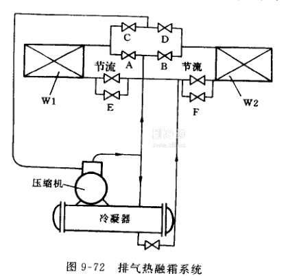 這個系統的工作過程是:當蒸發器W2需融霜時,關閉閥D打開閥B,此時壓縮機的排氣沿排氣管通過閥B進入蒸發器W2融化管外霜層。這時也要打開閥F,使在蒸發器B內冷凝成為液體的制冷劑進入蒸發器W1,以便去蒸發制冷,這個系統的特點是不影響蒸發器W1的工作,當融霜過后仍可繼續恢復蒸發器W2工作。