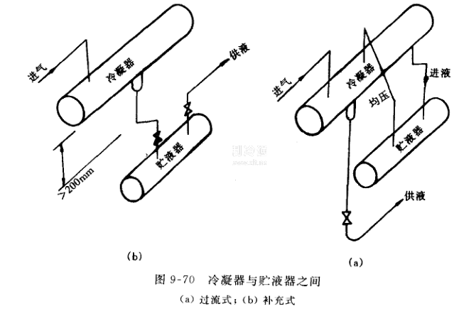 (2)對于過流式冷凝器,如圖9-70(a)所示,為了保證液體靠自重流入貯液器內(nèi),冷凝器的底部與貯液器進液閥之間的間距應>200mm,進液管流速應低于0. 5m/s。