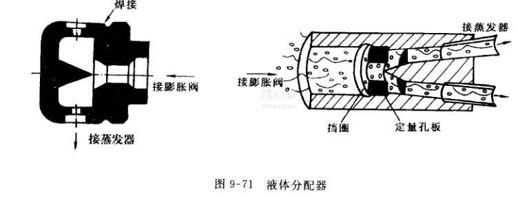當一個膨脹閥供給多組并聯(lián)的蒸發(fā)器液體時,需設液體分配器,小型系統(tǒng)可直接購買液體分配器(俗稱蓮蓬頭)。當系統(tǒng)稍大一點,可按圖9-71制作液體分配器。圖9-71的分配器均有一錐形體,當液體進人后與它相碰,并且碰后具有一定的流速,這就使液體夾裹著氣體,分別進人各個支管。由于阻力相同所以各支管的液體進人最是相同的,可以達到均勻分布的作用。