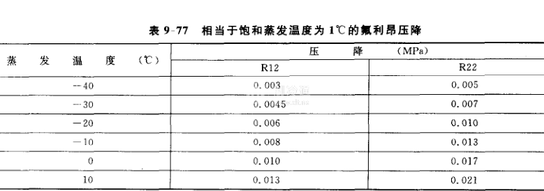 關于相當飽和蒸發溫度為1℃的氟利昂壓力降見表9-77。