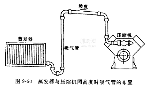 (3)蒸發器布置在壓縮機上面時,應在蒸發器上側設置倒U型管,如圖9-61所示,以防開車時液體進入壓縮機而引起液擊。但對全封閉式、半封閉式壓縮機來說,當液體進入壓縮機內,先經吸氣腔予以汽化過熱,再進入汽缸,若不設倒U形管,問題也不大。