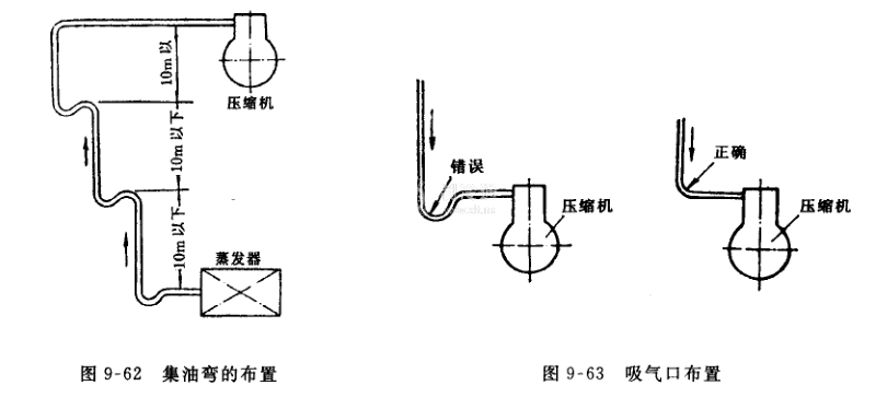 (4)當蒸發器布置在壓縮機下面時,為了改善回油,應每隔10m左右設置一個集油彎,如圖9-62所示。在壓縮機吸入口附近的吸氣管上不要設置集油彎,以防止啟動時滑油沖缸事故,如圖9-63所示。
