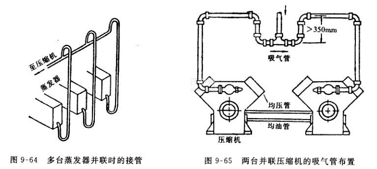 (6)當多臺蒸發器并聯時,為了不因某一臺或某幾臺蒸發器的負荷變化或停止運行時影響其他蒸發器的正常工作。可采用如圖9-64所示接法。