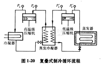 復疊式蒸汽壓縮制冷循環是由兩個或兩個以上的單級壓縮制冷循環組成,在每個單級制冷系統中充加不同性質的制冷劑。它既能滿足在較低溫度時,有合適的蒸發壓力,又能滿足在環境溫度條件下冷凝時,具有合適的冷凝壓力。