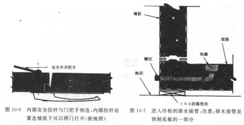 冷柜溫度依其用途而定。對于貯藏肉食及新鮮食品,沮度需要維持在20℃到4℃的范圍內,相對濕度為80%左右,要保持必要的空氣流動。紫外線燈也被用來抑制冷柜內細苗生長和發霉。由于過量照射紫外線對人體有害,在紫外線燈周圍工作時應避免紫外線照射。因此,當有人進入冷柜中時,應關掉紫外線燈。推薦一種排水方式,圖10-7給出安裝在永久樓板上部預制進入冷柜裝置排水的一般方法。