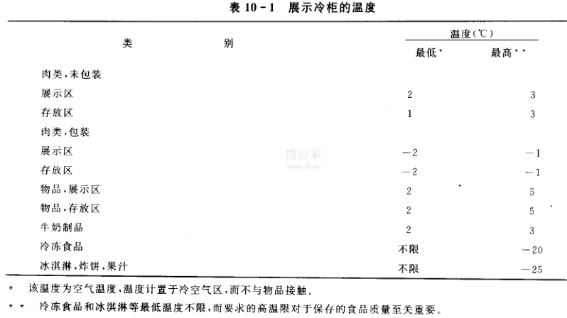 陳列柜又稱展示柜,用于存放買主可看見的物品,因此前面必須是玻璃門,有的兩側(cè)也用玻璃,以提高對陳列物品的透視程度。柜中溫度由其用途決定,表10-1列出一些常用的推薦溫度。展示柜的照明燈一般安裝在玻璃外部,使燈產(chǎn)生的熱量不致增加冷負荷。