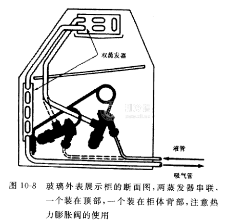 有一種常用的展示柜,使用頂置蒸發器。這種展示柜,其主蒸發器安裝在展示空間的上部區域。頂部柜架之下,見圖10-8。它能使展示區域各處均保持適宜的溫度。
