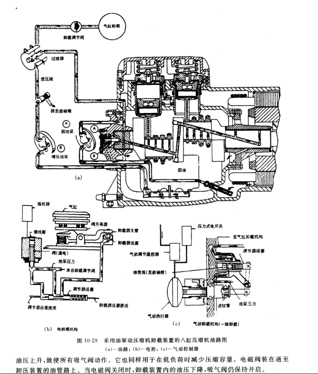 商用壓縮機(jī)有開(kāi)啟式、半封閉式和全封閉式。小型壓縮機(jī)多為單缸,單相電動(dòng)機(jī)驅(qū)動(dòng);較大的壓縮機(jī)為雙缸或多缸,由三相電動(dòng)機(jī)驅(qū)動(dòng),為了空載起動(dòng)和運(yùn)行中的卸負(fù),一般設(shè)有液動(dòng)或電動(dòng)卸載裝置,以控制壓縮機(jī)運(yùn)行的氣缸數(shù),當(dāng)負(fù)荷增加時(shí)使更多的氣缸壓送氣體。反之減少運(yùn)行氣缸數(shù)。圖10-29給出了壓縮機(jī)的油路系統(tǒng),并展示了怎樣卸載的電動(dòng)和氣動(dòng)執(zhí)行機(jī)構(gòu)。