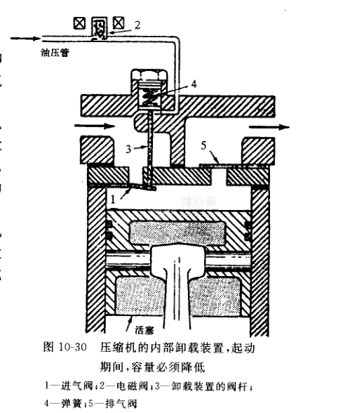 圖10-30是一個(gè)氣缸的內(nèi)部卸載裝置,它通過(guò)油壓操縱。彈簧支撐使吸氣閥開(kāi)啟直到油壓上升,致使所有吸氣閥動(dòng)作。它也同樣用于在低負(fù)荷時(shí)減少壓縮容量。電磁閥裝在通至卸壓裝置的油管路上,當(dāng)電磁閥關(guān)閉時(shí),卸載裝置內(nèi)的油壓下降,吸氣閥仍保持開(kāi)啟。