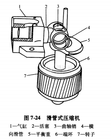 按活塞往復運動的驅動方式,可分為曲柄連桿式(見圖7-23)和滑管式(見圖7-24)兩種。滑管式一般用于小型產品。如圖7-23所示全封閉式壓縮機結構中,可見電動機和壓縮機做成整體,利用上下兩個彈簧進行支撐,置于鋼板外殼中。吸氣從殼體上部進入,在電動機上部氣液分離后,再通過電動機定子外部對電動機進行冷卻,然后進入機體吸氣室,這樣整個殼體是處在低壓氣體中。殼體下部是潤滑油,利用主軸下部離心泵的作用,將油吸入并壓送至各活動部位。為了減少氣體脈動的影響,排氣管路裝有消聲器。