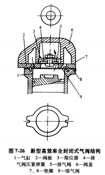 圖7-25示出小容量全封閉式壓縮機的簧片閥結構。圖7-26是新型高效率全封閉式氣閥結構,該環形閥結構可以通過在活塞頂部凸出形狀以減少余隙容積,從而提高效率。