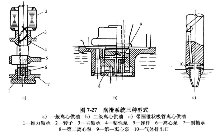 潤滑系統有如圖7-27所示三種型式,其中圖b為二級離心泵,用于變頻驅動,在低速時能確保供油。
