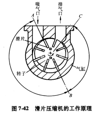 隨轉子的旋轉,滑片由A逆時鐘方向運動,使之與其后滑片及氣缸壁所圍成的小室容積不斷擴大,氣體被吸人小室內。當滑片轉到B點時,小室容積達到最大值,并與吸氣口隔開,吸氣結束,此時小室的容積即為吸氣容積,由A到B即為吸氣過程。當轉子繼續轉動,小室容積不斷縮小,其內氣體壓力不斷升高,直至滑片頂端到達C位置。當滑片回到A點時,排氣結束,小室容積達到最小值。轉子繼續旋轉,小室容積又開始增大,待殘留在該最小容積中的高壓氣體膨脹降版后,又開始吸氣。如果滑片數為z片,則轉子每旋轉一周,依次有z個小室分別進行吸氣一壓縮一排氣一膨脹過程。