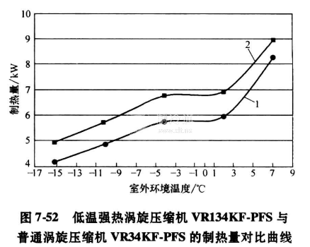 低溫渦旋壓縮機(jī)除了常規(guī)的吸氣口和排氣口外,還具有第二吸氣口,即蒸氣噴射口,中壓的制冷劑蒸氣通過蒸氣噴射口和位于禍旋盤的通道噴射到渦旋盤的中間腔,以增加制冷機(jī)流量,結(jié)合帶經(jīng)濟(jì)器的系統(tǒng)設(shè)計(jì),達(dá)到增加系統(tǒng)質(zhì)熱量,提高了運(yùn)行可靠性。圖7-52給出了谷輪公司低溫強(qiáng)熱渦旋壓縮機(jī)VRI34KF-PFS與普通渦旋壓縮機(jī)VR34 KF-PFS的制熱量對(duì)比曲線。