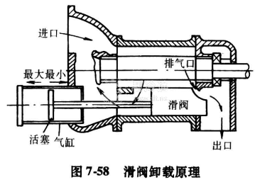 1)調節排出口孔的容量調節滑閥。此種型式的滑閥被置放在高壓側區域。它不但調節容量,而且在部分負荷時,還改變徑向排出孔口的位置,其軸向排出孔口被設計成能提供最佳部分負荷性能而不損失滿負荷性能。圖7-58所示為最常用的一種原理圖。