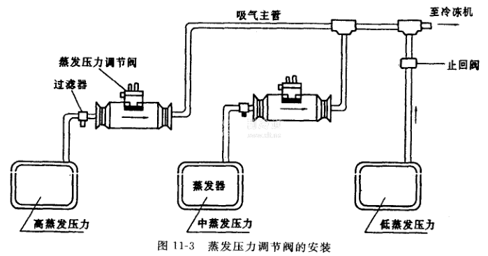 蒸發(fā)壓力調(diào)節(jié)閥用在一機(jī)多庫的制冷系統(tǒng)中,它被安裝在各冷卻系統(tǒng)的蒸發(fā)器的出口管道上,如圖11-3所示,利用調(diào)節(jié)閥的入口壓力來控制閥口開度,使各冷藏庫在各自不同的蒸發(fā)壓力下獲得不同的庫溫,又有一個(gè)相同的制冷機(jī)吸氣壓力。為了防止高蒸發(fā)壓力制冷劑蒸氣倒流入低蒸發(fā)壓力的蒸發(fā)器中一般在低蒸發(fā)器的出日處要加裝止回閥。