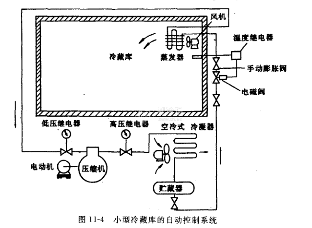 對冷藏庫的溫度進行控制,使庫溫低于規定溫度時,壓縮機停止運轉;而當庫溫高于規定溫度時,壓縮機起動運轉(一般稱為雙位控制),這不僅節省了電力,而且還保證了冷藏貨物的質量。但是,單純采用溫度繼電器控制壓縮機的開停是不行的。因為停機時,液體會繼續進入蒸發器,再起動時又很容易產生液擊及潮車運轉。為此,需要在膨脹閥的人口處加裝電磁閥,如圖11-4所示。溫度繼電器不直接控制壓縮機的開停,而是控制電磁閥的通斷。當冷藏庫溫下降時,溫度繼電器動作.使電磁閥關閉,停止供液,而蒸發器內的制冷劑繼續燕發并為壓縮機所吸入,并貯存于冷凝器或貯液器中。當蒸發器壓力逐漸下降至低于低壓壓力繼電器調定值時(壓力繼電器調定值一般控制在9. 8kPa左右),低壓壓力繼電器動作,使壓縮機停止工作。庫內溫度再次上升,溫度繼電器動作,電磁閥開啟并供液,液態制冷劑蒸發后通過吸氣管使吸入端壓力上升。與此同時,低壓壓力繼電器內壓力也上升,繼電器動作,接通微動開關,壓縮機重新起動運轉。這種控制方法可以防止液體制冷劑回流至壓縮機內。