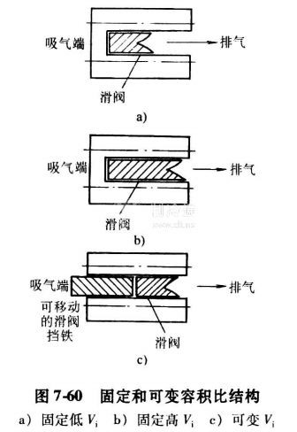 有些雙螺桿壓縮機能在運行時調節壓縮機的容積比至最有效的比值,以適應當時的運行工況。在固定容積比壓縮機中,滑閥移動至機器吸氣端,碰到轉子殼體時將停止。大部分常見的可變容積比的機器中,該部分的轉子殼體已經由一個第二滑閥所代替,即可移動的滑閥擋塊,該擋塊可被推動至滑閥孔的不同位置(見圖7-60)