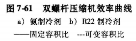 通過正反方向移動該滑塊,排氣徑向孔在運行中可重新定位,以適應最佳壓縮機的容積比。所增加的靈活性,可允許在不同吸氣和排氣壓力下保持最佳效率。固定容積比和可變容積比螺桿壓縮機,在采用R22及氨制冷劑時,滿負荷運行的相對效率比較見圖7-61。從圖中可知,具有可變容積比的壓縮機效率曲線,在一個寬廣的壓力比范圍內均有最高的效率。此外,它還有噪聲低、排氣溫度低、壽命長等許多優點。