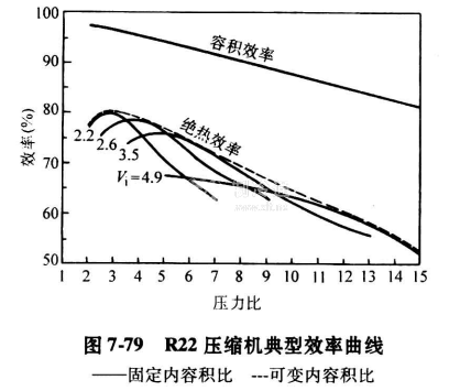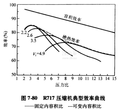 7-79和圖7-80示出所有單螺桿壓縮機的典型效率曲線。圖中Vi是壓縮機的內容積比,它決定于壓縮機的設計。和雙螺桿壓縮機一樣,單螺桿壓縮機有固定的內容積比,它等于在起動時的齒格容積和該齒槽和排出孔相連時的容積之比。近代設計的用于制冷的單螺桿壓縮機,都裝有在壓縮機運行時可變容積比的裝置。它是一簡單滑閥,可超前或延遲排氣孔口位置。