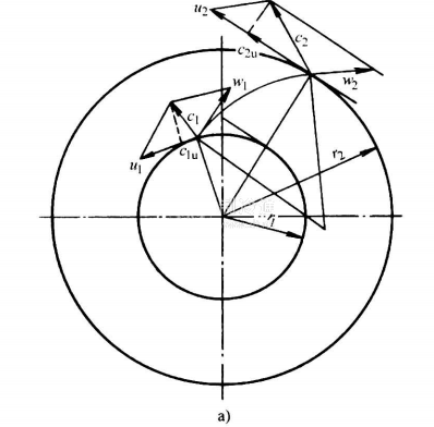 離心壓縮機的壓縮過程可按圖7-81予以說明。自蒸發器蒸發的制冷劑氣體,被單級葉輪吸入,通過葉輪、擴壓器、蝸殼等零件,壓力升高后送入冷凝器。制冷劑氣體進入葉輪后,如圖7-81a那樣由徑向流入葉輪的葉片??赏ㄟ^從葉輪進口圓周速度u1,和進入氣體的絕對速度的矢量差,求得葉輪入口的相對速度w1。在葉輪出[11.亦可通過圓周速度u2和氣體出口絕對速度c2之矢量差求得葉輪出口的相對速度w2。圖7-81b示出進出口速度三角形。氣流是沿著葉片進行的,β1角是葉片進口角,β2角是葉片出門角度。制冷劑氣體以絕對速度c2和角α2進入擴壓器,葉輪出口的高速動能通過擴壓器和蝸殼,轉變為壓力能。