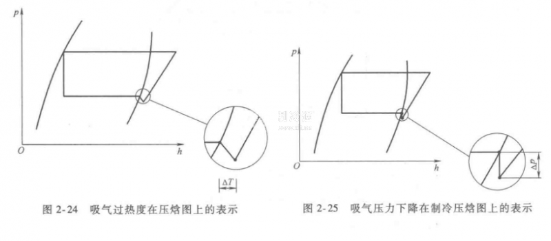 這種吸氣壓力下降在制冷壓焓圖上的表現形式,是蒸發溫度的飽和溫度點向下的直線,如圖2-25所示。