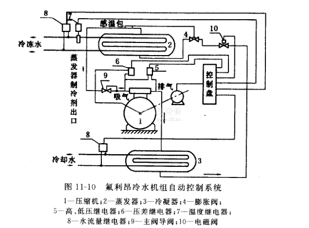圖11-10中,使用冷凍水作為載冷劑的蒸發器,制冷劑在管內蒸發,循環水在管外流動,為控制制冷劑在管路的流量,采用了較簡單的溫度式膨脹閥4。膨脹閥的感溫包安裝在蒸發器的制冷劑出口管路上,膨脹閥則安裝在給蒸發器供液的管道上,在膨脹閥前的供液管道上裝有電磁閥10,它的電路與壓縮機的電路連鎖,當壓縮機起動時,必須待壓縮機運轉后,電磁閥的線圈才通電,開啟閥門向蒸發器供液。使壓縮機易于起動。反之,停機時,首先切斷電磁閥線圈電路,關閉閥門停止向蒸發器供液后,再切斷壓縮機電源,這樣當再次起動壓縮機時,可避免產生液擊現象,自動保證制冷壓縮機起動和停機。