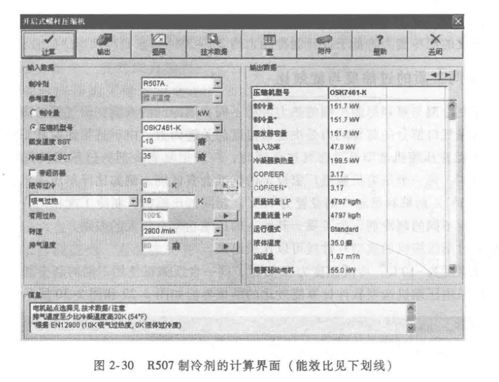 在蒸發溫度為-10℃,冷凝溫度為35℃時,同一臺壓縮機使用不同的制冷劑(氨和氟利昂R507)。采用壓縮機選型軟件計算能效比的結果界面如圖2-29和圖2-30所示。