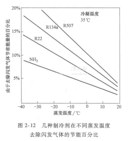 眾所周知,在制冷循環中所需的壓縮功率與各種制冷劑的物理特性相關。在相同的蒸發溫度下R507的密度要比氨大很多,圖2-12中-10℃氟利昂R507去除閃發氣體比氨要節約不到9%的能量,在這里反而多耗能12.62%。因此在合理的范圍內控制壓縮機的過熱度是系統節能的一個重要部分。
