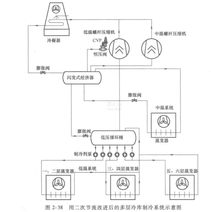 對(duì)于高層冷庫(kù),如果這些冷間的溫度都相同,那么圖2-36所示的系統(tǒng)可以擴(kuò)展成為圖2-38所示的系統(tǒng)。在這種系統(tǒng)中,只需要一臺(tái)低壓循環(huán)桶,因?yàn)檎舭l(fā)溫度是一樣的。注意這種系統(tǒng)應(yīng)該選用不同揚(yáng)程的制冷劑泵分別滿足不同層的蒸發(fā)器供液,可以明顯降低初投資及運(yùn)行費(fèi)用。