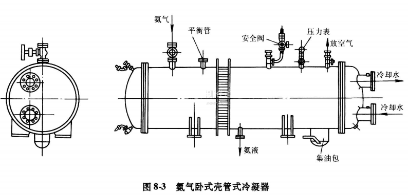 氨液的密度比冷凍機油小,并且氨與冷凍機油互不溶解,所以在氨臥式冷凝器底部設有集油包,積聚在集油包內的冷凍機油,由放油管引向集油器。