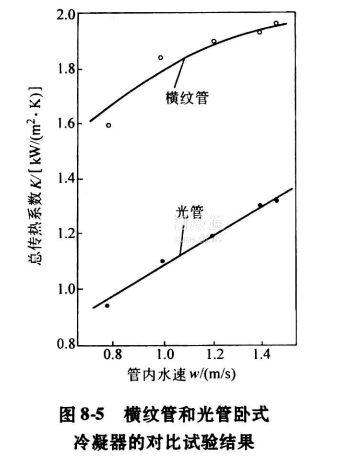氨臥式冷凝器內傳熱管一般采用φ55mm,φ32mm或φ38mm的無縫鋼管。為了強化傳熱效果,國內曾用螺紋管、橫紋管氨臥式冷凝器做過試驗。螺紋管由φ25mm x 2. 5mm光管軋制而成,肋化系數為2.75。在相同條件下,螺紋管氨臥式冷凝器的傳熱系數比光竹提高40%以上。橫紋管用φ25mm x 2. 5mm光管采用機械滾軋方法加工成形,外表面為一道道與管軸成90°交角的橫向溝槽,管內呈相應凸肋、節距9mm,槽深0.8mm,橫紋管氨臥式冷凝器傳熱系數比光管提高65%。圖8-5為橫紋管氨臥式冷凝器和光管臥式冷凝器的對比試驗結果。
