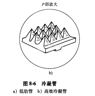 鹵代烴類制冷劑用的臥式冷凝器的傳熱管一般采用銅管,除了使用光銅管外,大量使用如圖8-6a所示低肋管。目前常用的管徑為19~25mm,肋片距白1. 6mm發展至0.5mm。