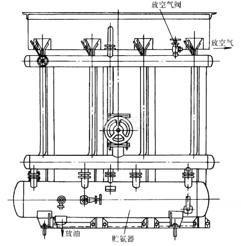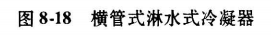 淋水式冷凝器又稱為淋激式冷凝器。根據(jù)傳熱管排列不同分為兩種:一種是用無縫鋼管制成蛇形管組,稱為橫管淋水式冷凝器(一般簡稱為淋水式冷凝器);另一種用無縫管彎制成螺旋形管組裝而成,稱為螺旋管淋水式冷凝器。圖8-18為橫管淋水式冷凝器示意圖。冷卻水從上部配水箱流入水槽中,經水槽鋸齒形溢水口均勻地流下,淋澆在冷卻管組外表面,最后流入水池。制冷劑蒸氣由下部進入冷卻管組,管內凝結的制冷劑液體從冷卻管一端彎頭處支管導出,后經主管流入貯液器。淋水式冷凝器一般用于氨制冷裝置。