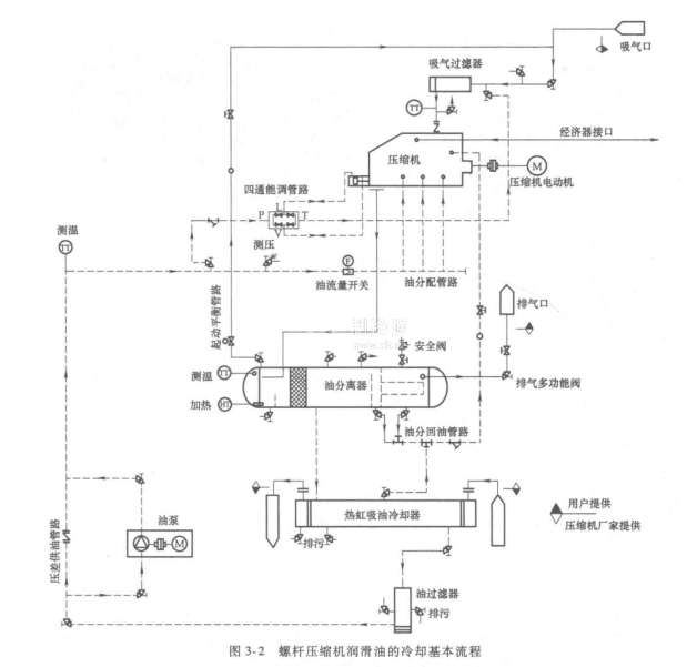 第二種冷卻方法—冷卻水外部冷卻是用冷卻水通過管殼式換熱器。圖3-3顯示了螺桿壓縮機(jī)油冷卻器與油路之間的相對(duì)位置。