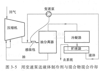 3)當(dāng)壓縮氣體與潤滑油的混合物離開壓縮機(jī)時(shí),用變速泵將液體制冷劑與混合物混合再進(jìn)入油分離器(圖3-5)。