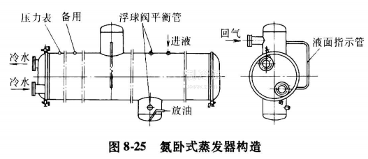 制冷劑液體由臥式蒸發器底部或側面進入,蒸發以后的蒸氣從上部流出。為了將蒸氣中挾帶的液滴分離出來,蒸發器上方應留有一定空間。在氨臥式蒸發器的筒體上裝有氣包。在殼體下部裝有集油器,以便排放積存的冷凍機油及其他雜物。氨臥式蒸發器構造如圖8-25所示。