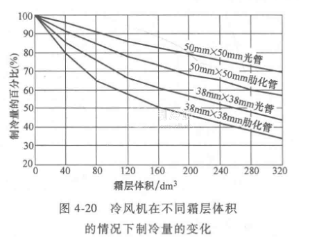 這里以一臺(tái)R404A直接膨脹系統(tǒng)制冷量29kW,風(fēng)量20000m3/h,蒸發(fā)溫度-59℃,對(duì)數(shù)溫差△t=6K, 7mm片距的冷風(fēng)機(jī)為例,圖4-20所示是這臺(tái)冷風(fēng)機(jī)在不同霜層體積的情況下制冷量的變化。