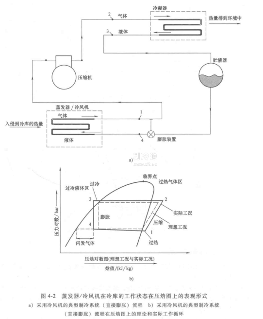 首先了解蒸發(fā)器/冷風機在冷庫的工作狀態(tài)在壓熔圖上的表現(xiàn)形式,圖4-2a是采用冷風機的典型制冷系統(tǒng)(直接膨脹)流程,圖4-2b是該流程在壓焓圖上的表示。