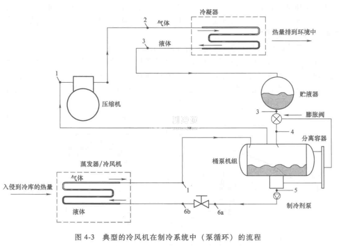 圖4-3是采用冷風機的典型制冷系統(tǒng)(泵循環(huán))流程。圖4-4是該流程在壓焓圖上的表示。