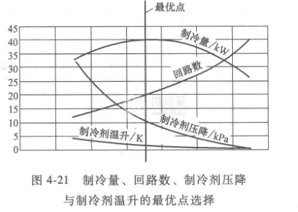 根據上述數據,通過測試得出表4-6以及圖4-21。通過各種參數的變化曲線,在制冷量的曲線最高點,對應地得出最佳的蒸發回路、制冷劑壓降以及溫升。