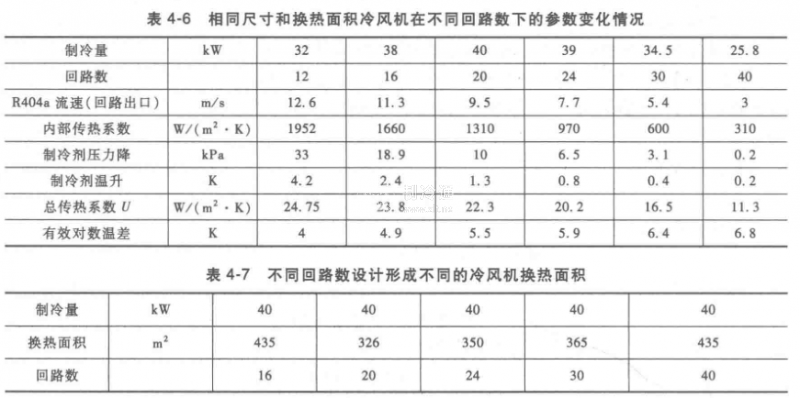 可以看到20個回路的設計可以使制冷量最大達到40kW。反過來,如果需要選擇一臺40kW的冷風機,不同的回路數設計會形成不同的冷風機換熱面積。可以參考表4-7。