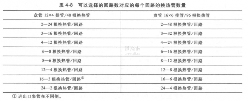 盤管選型時可以根據換熱管數量,正對同側進出口集管,選擇不同的回路數設計。可以參考表4-8。