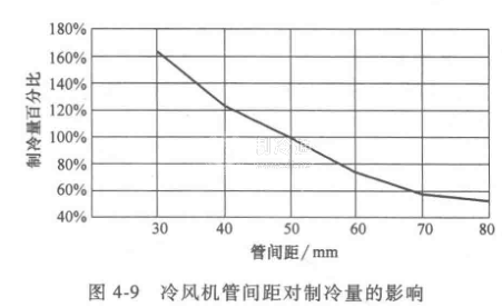 冷風(fēng)機(jī)蒸發(fā)盤管之間的距離究竟能對(duì)冷風(fēng)機(jī)制冷量產(chǎn)生多大影響?圖4-9中的數(shù)據(jù)顯示了管間距對(duì)冷風(fēng)機(jī)制冷量的影響,管間距越大,制冷量越小。但管間距小,制冷量雖然增大,風(fēng)通過(guò)的阻力也增大,意味著容易結(jié)霜。經(jīng)綜合考慮,K生產(chǎn)廠家選擇的管間距是50mmx50mm。