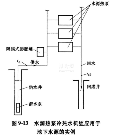 目前水源熱泵冷熱水機組主要用于下列各種空調系統:①水環熱泵空調系統;②地源熱泵空調系統,該系統又可分為地表水熱泵系統、地下水熱泵系統和地埋管熱泵系統;③其他廢熱源空調系統。圖9-13是一種水源熱泵冷熱水機組的用于地下水源的實例。