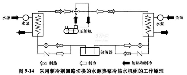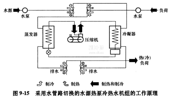 在圖9-14中,在制冷工況下,壓縮機將低壓制冷劑蒸氣壓縮后成為高壓制冷劑氣體進入水源側換熱器,通過與水的熱交換而使制冷劑冷凝為高壓液體,經節流裝置膨脹后進入負荷側換熱器。和負荷側的水介質進行熱交換后變為低壓蒸氣返回版縮機。在制熱工況下,通過四通閥的切換,使制冷工況時的冷凝器在這時變為蒸發器。而制冷工況時的蒸發器變為冷凝器。通過蒸發器吸收水的熱量,在熱泵循環過程中,從冷凝器向負荷側的熱量載體(水)放熱。