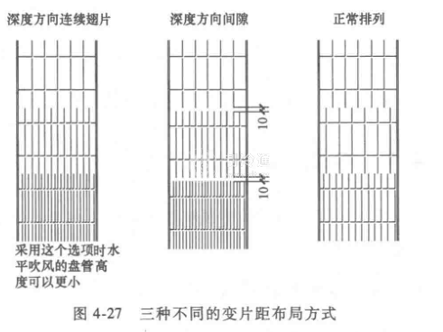 顯然,翅片間距越大,需要的材料越多,冷風機價格越高??s小翅片間距能降低冷風機1kW制冷量的價格。變片距冷風機可以采用多種不同的布局方式。圖4-27所示為三種不同的布局方式。在下訂單之前需要和冷風機制造廠家確認采用哪種布局方式,同時對照不同的報價,了解如何生產這種產品。
