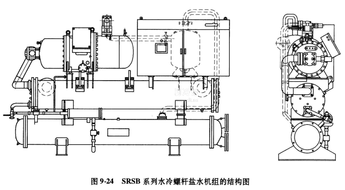 圖9-24是上海冷氣機廠的SRSB系列水冷螺桿鹽水機組的結構圖。該系列鹽水機組有外置油分離器但沒有采用經濟器,機組設計的最低蒸發溫度為-30℃,機組有制冷劑冷卻的板式油冷卻器、一級噴液冷卻裝置等油冷卻和排氣溫度調節裝置等。機組中設置了油壓差控制器和油位開關監測壓縮機的油位,采用微電腦控制,可以檢測各種運行狀態,并且根據監測的運行參數,自動調節機組的運行狀態和各種保護值,防止機組在鹽水濃度偏低時凍結蒸發器的危險,并自動發出停止運行信號。