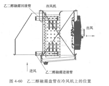 乙二醉融霜(采用制冷換熱管,即與蒸發盤管結構一樣)[3]主要應用于大型制冷系統,即采用冷風機作為蒸發器的二氧化碳制冷系統,或者氟利昂制冷系統的融箱系統中。